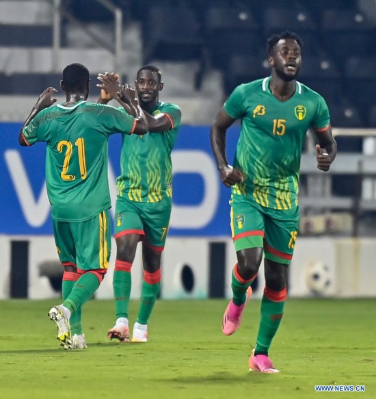 Ismael Diakhite (C) of Mauritania celebrates with teammates after scoring the opening goalduring the FIFA Arab Cup Qatar 2021 qualifying round football match between Mauritania and Yemen in Doha, Qatar, June 22, 2021. (Photo by Nikku/Xinhua)