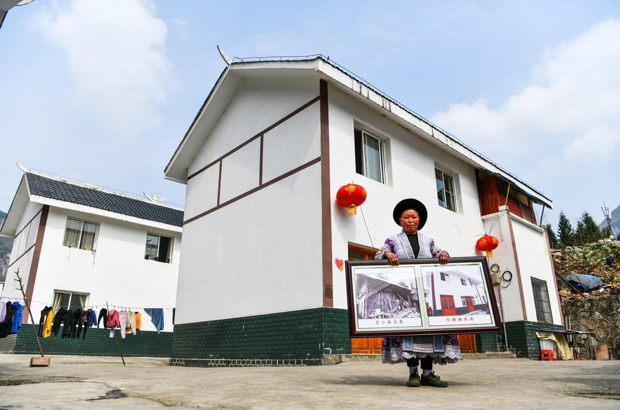 A woman standing in front of her new residence shows photos of her houses before and after the relocation at the relocation site for poverty-stricken people in Huawu Village in Qianxi County, southwest China's Guizhou Province, Feb. 20, 2021. (Xinhua/Yang Wenbin)