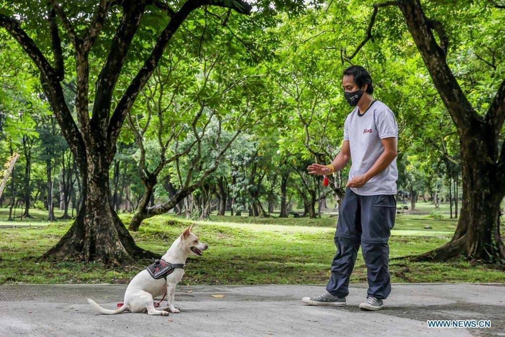 Nano, a former stray dog, is trained to "sit and wait" by handler during the University of the Philippines (UP) Sagip (Rescue) K9 training at the UP Campus in Manila, the Philippines on June 23, 2021. The UP Sagip (Rescue) K9 aims to find purpose and care for the saved stray dogs that were left unfed because of the COVID-19 pandemic by undergoing search and rescue training. (Xinhua/Rouelle Umali)