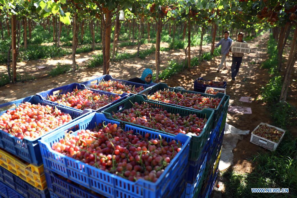Grapes are seen at a grape farm in Sadat city of Menoufia province, Egypt, June 14, 2021. At a vast grape farm in Sadat City of Menoufia province, north of Cairo, dozens of well-trained workers carefully harvested clusters of grapes dangling beneath the green leaves. (Xinhua/Ahmed Gomaa)
