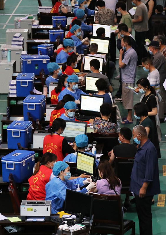 Citizens receive COVID-19 vaccination at a vaccination site in Zhoushan, east China's Zhejiang province, June 22, 2021. (People's Daily Online/ Chen Yongjian)