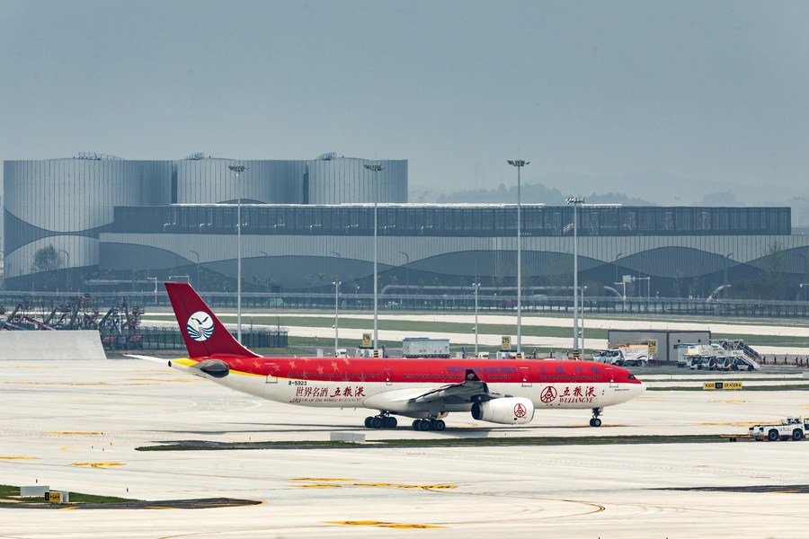 A Sichuan Airlines flight is ready to take off at the Chengdu Tianfu International Airport. (Xinhua/Shen Bohan)