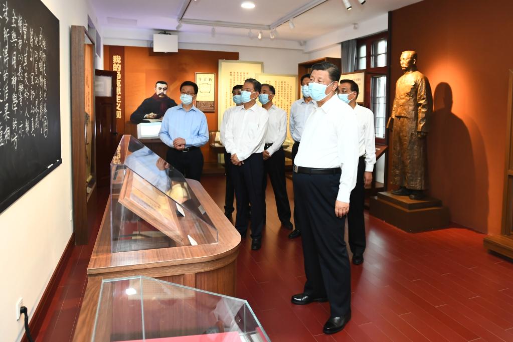 Xi Jinping, Li Keqiang, Li Zhanshu, Wang Yang, Wang Huning, Zhao Leji and Han Zheng visit the "Red Building," once the main campus of Peking University, and learn about the history of preparation and founding of the Communist Party of China at an exhibition in Beijing, capital of China, June 25, 2021. A group study session of the Political Bureau of the Communist Party of China Central Committee was held on Friday. (Xinhua/Xie Huanchi)