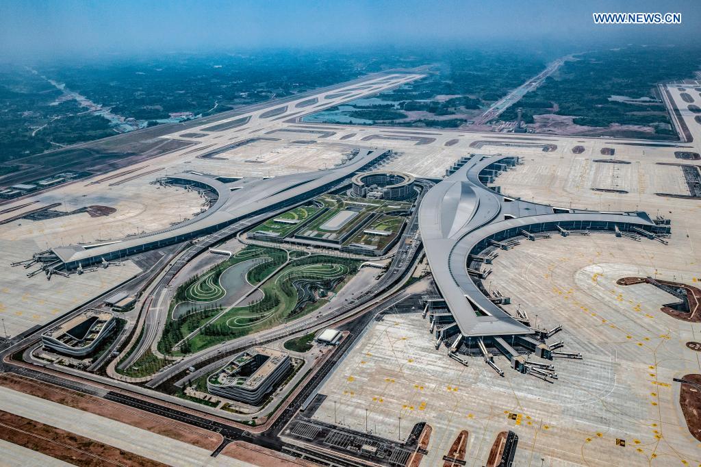 Aerial photo taken on May 31, 2021 shows the Chengdu Tianfu International Airport in Chengdu, southwest China's Sichuan Province. Chengdu Tianfu International Airport in southwest China's Sichuan Province has opened for operations, with a Sichuan Airlines flight bound for Beijing taking off on Sunday morning. (Photo by Liu Yinghua/Xinhua)