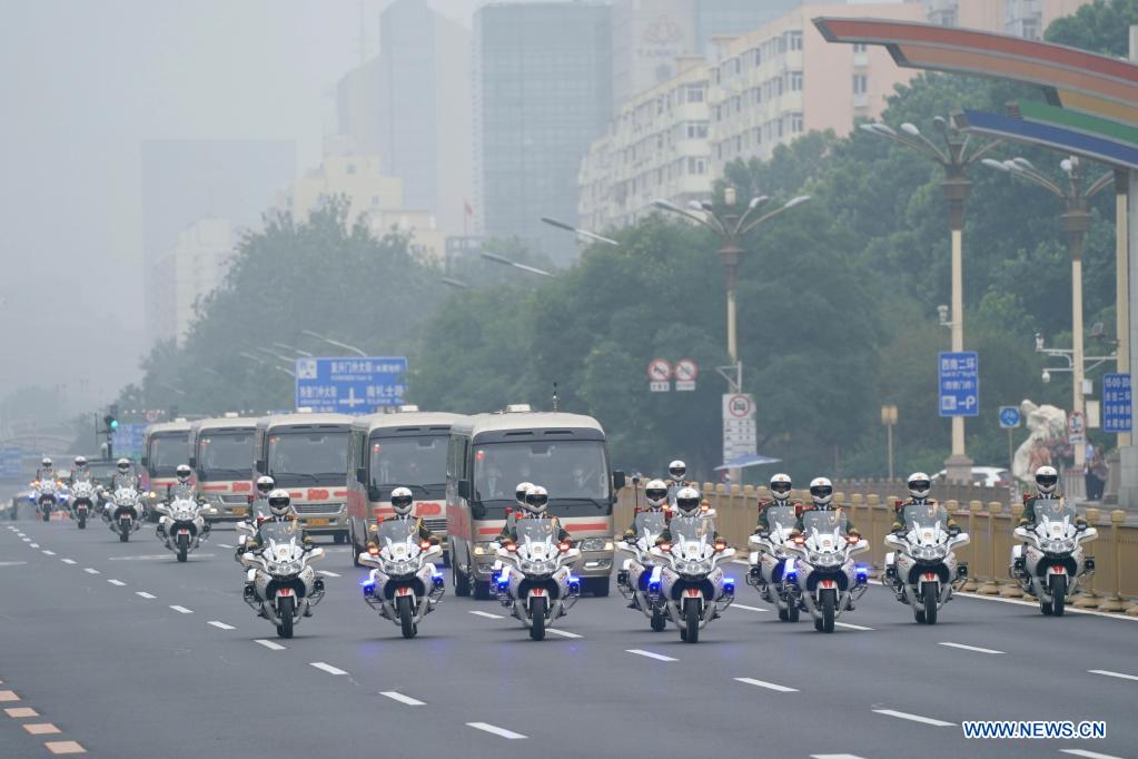 The motorcade carrying recipients of the July 1 Medal is accompanied by motorcycle escorts on the way to the Great Hall of the People in Beijing, capital of China, June 29, 2021. A ceremony is about to be held Tuesday morning to award the July 1 Medal, the highest honor in the Communist Party of China (CPC), to outstanding Party members for the first time. The ceremony will be held at the Great Hall of the People in Beijing. (Xinhua/Xing Guangli)