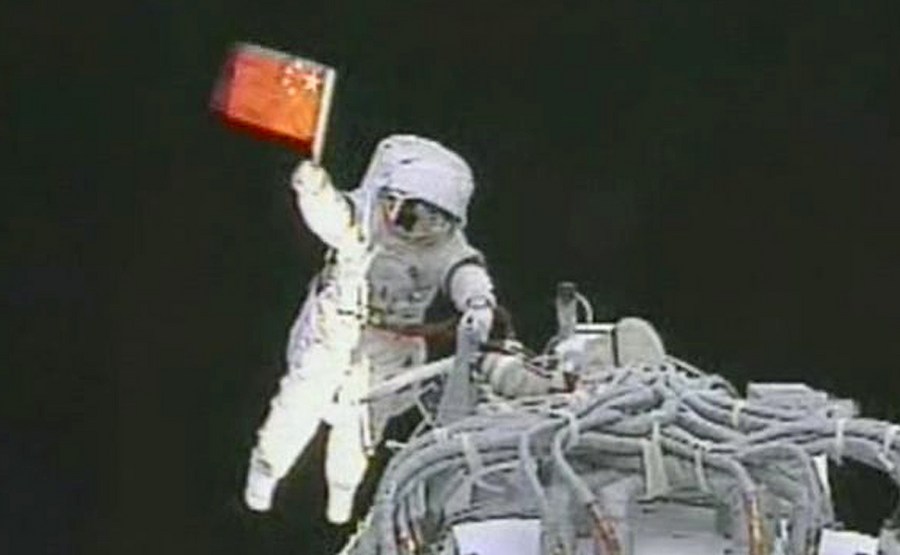 The video grab taken on Sept. 27, 2008 shows Zhai Zhigang waving a China's national flag outside the orbital module of the Shenzhou-7 spacecraft during his spacewalk. (Xinhua/Zha Chunming)