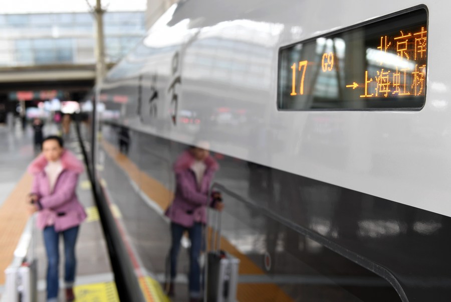 A Fuxing bullet train is seen at Beijing South Railway Station in Beijing, capital of China, Jan. 5, 2019. (Xinhua/Zhang Chenlin)