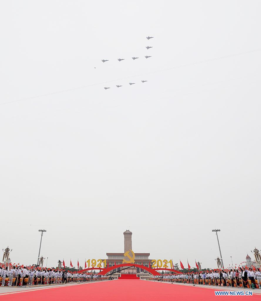 Military aircraft fly over Tian'anmen Square in echelons ahead of a grand gathering celebrating the Communist Party of China (CPC) centenary in Beijing, capital of China, July 1, 2021. (Xinhua/Xing Guangli)