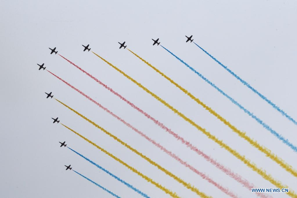 Military aircraft fly in echelon ahead of a grand gathering celebrating the Communist Party of China (CPC) centenary in Beijing, capital of China, July 1, 2021. (Xinhua/Li Mengjiao)