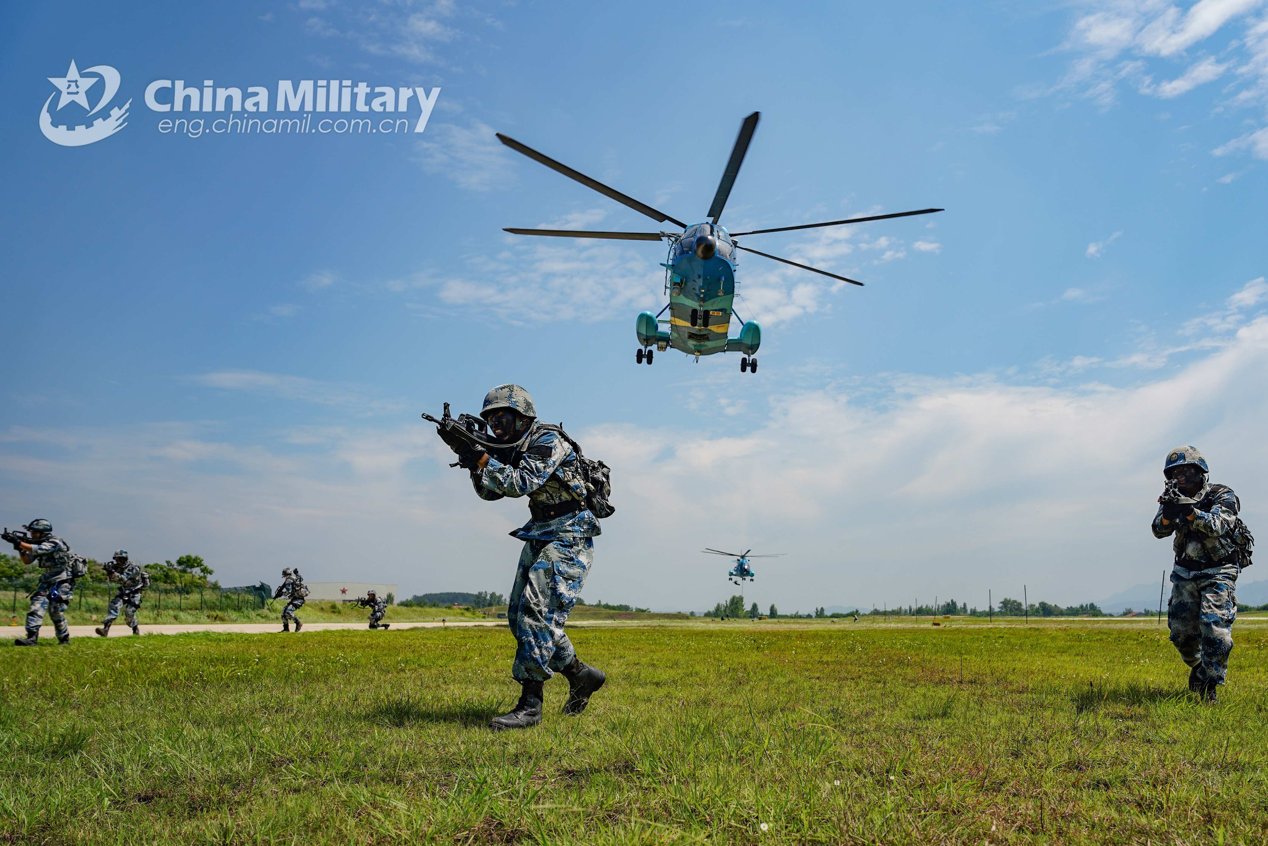 Airmen assigned to the PLA Air Force's airborne troops make their way slowly with rifles after fast-roping from the transport helicopters during a recent fast-roping exercise designed to advance airborne interoperability among the troops in central China's Hubei Province. (eng.chinamil.com.cn/Photo by Liu Xingkai and Wang Hanfeng)