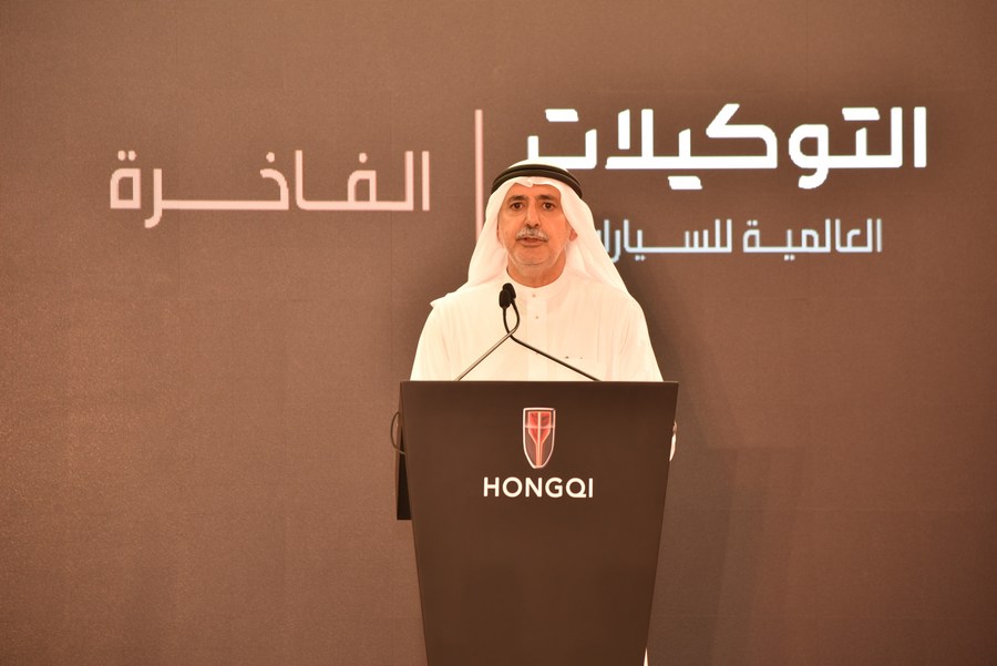 Mohammed Abduljawad, chairman & CEO of Universal Motors Agencies, gives a welcome speech at the opening ceremony for the Hongqi sales center in the Saudi capital of Riyadh, on June 30, 2021. (Xinhua/Wang Haizhou)