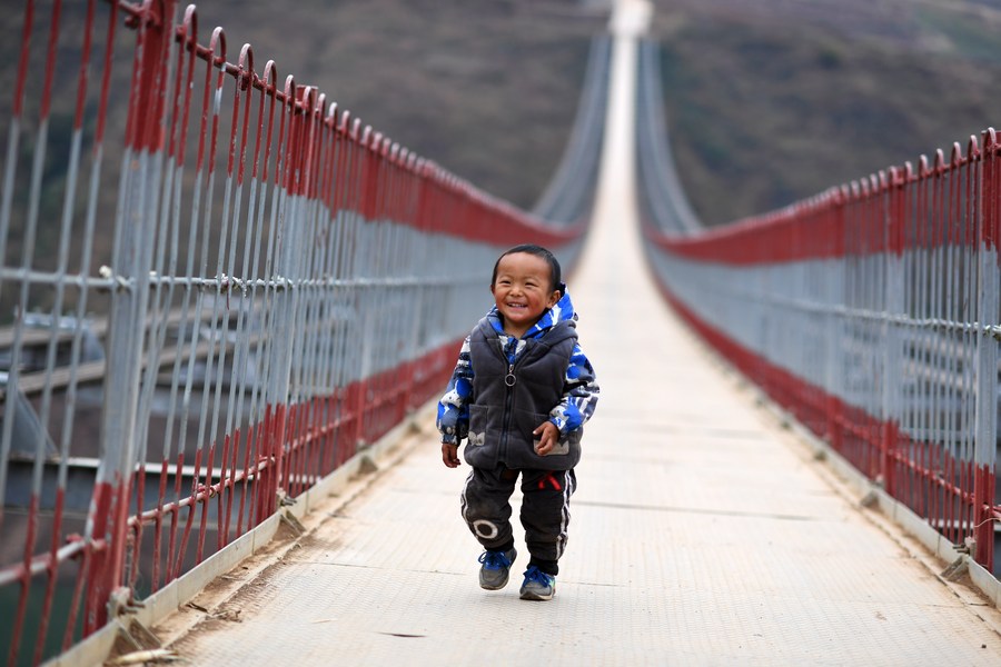 A little boy walks on a suspension bridge rebuilt from a cableway in Yulong Township, Weining County of southwest China's Guizhou Province, Feb. 11, 2019. (Xinhua/Yang Wenbin)