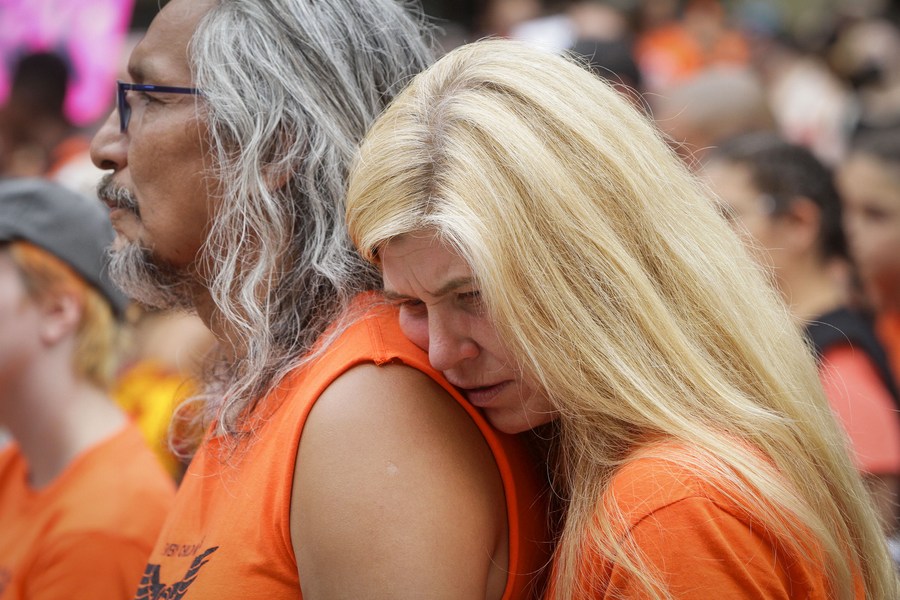 People take part in an event to mourn for victims who died of abuses by former indigenous residential schools in Toronto, Canada, on July 1, 2021. (Photo by Zou Zheng/Xinhua)