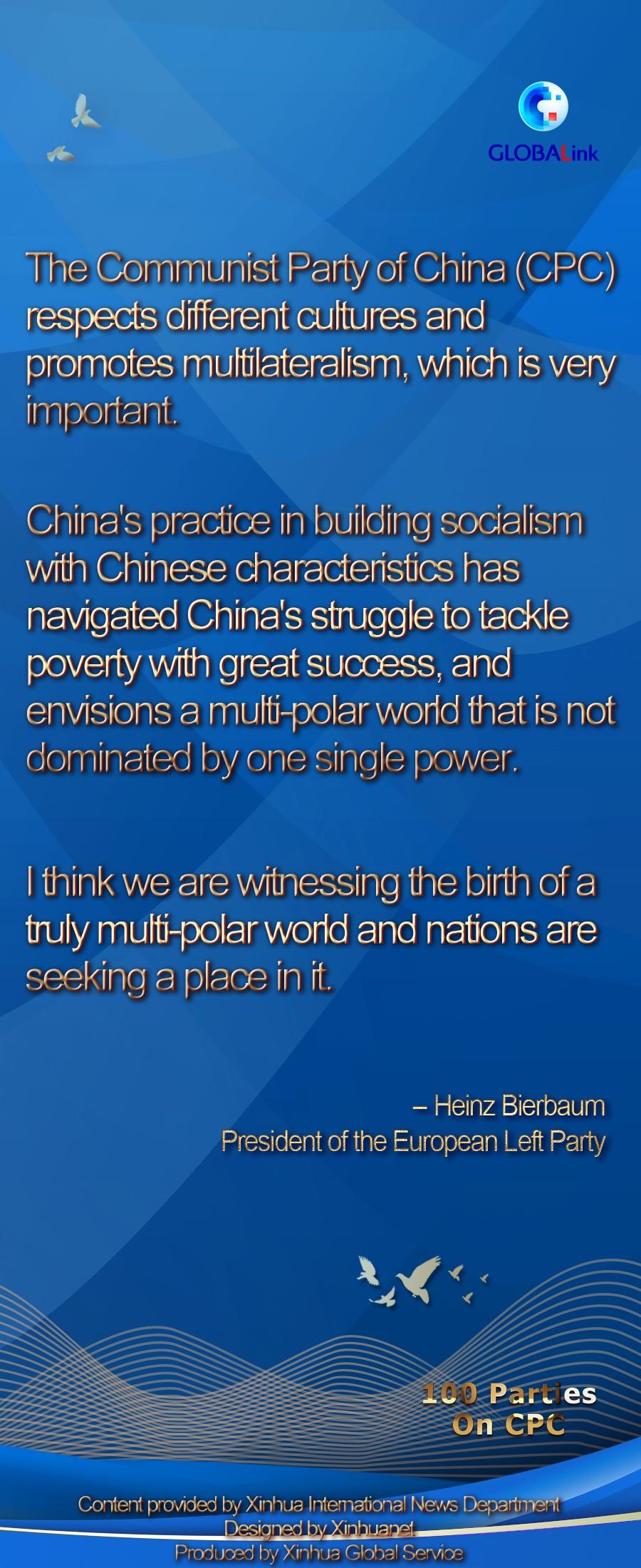 BRUSSELS, July 4 (Xinhua) -- The Communist Party of China (CPC) respects different cultures and promotes multilateralism, which is very important, President of the European Left Party Heinz Bierbaum said in a recent joint interview with Xinhua and People's Daily.