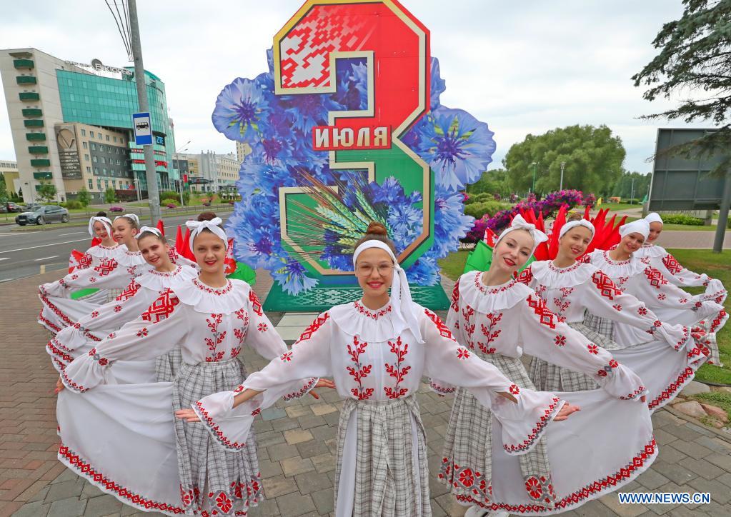 Performers dance on the street marking the Independence Day in Minsk, Belarus, July 3, 2021. (Photo by Henadz Zhinkov/Xinhua)