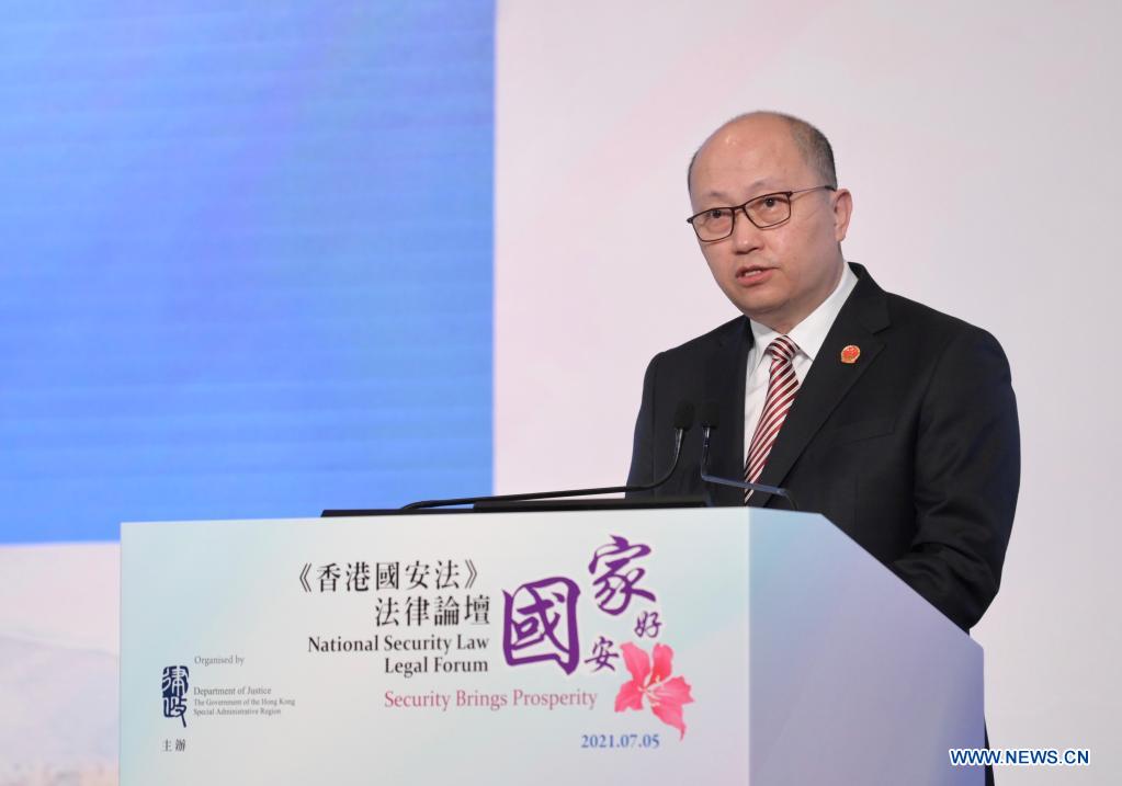 Zheng Yanxiong, director of the Office for Safeguarding National Security of the Central People's Government in the Hong Kong Special Administrative Region (HKSAR), addresses a forum entitled "National Security Law Legal Forum -- Security Brings Prosperity" in south China's Hong Kong, July 5, 2021. (Xinhua)