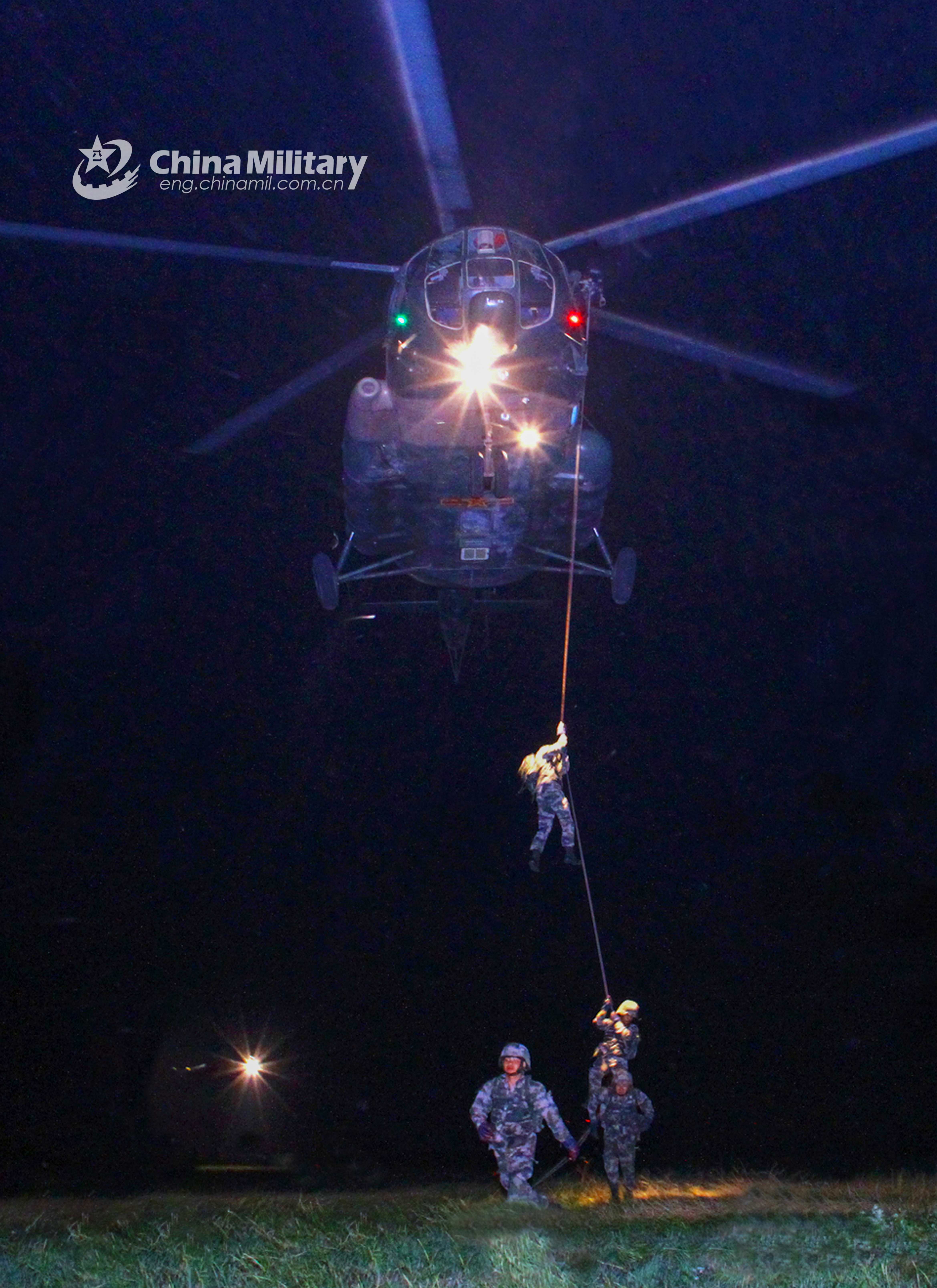 Soldiers assigned to an army aviation brigade under the PLA 71st Group Army practice exiting a transport helicopter during a night fast-roping exercise on June 18, 2021. (eng.chinamil.com.cn/Photo by Zhang Mao)