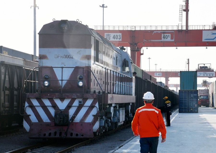 File photo taken on Nov. 9, 2020 shows a train carrying tires, auto parts, electronic components and other goods from Japan and the Republic of Korea (ROK) preparing to leave the Qingdao multimodal transportation center in the China-SCO local economic and trade cooperation demonstration zone in Qingdao, east China's Shandong Province. (Xinhua/Li Ziheng)