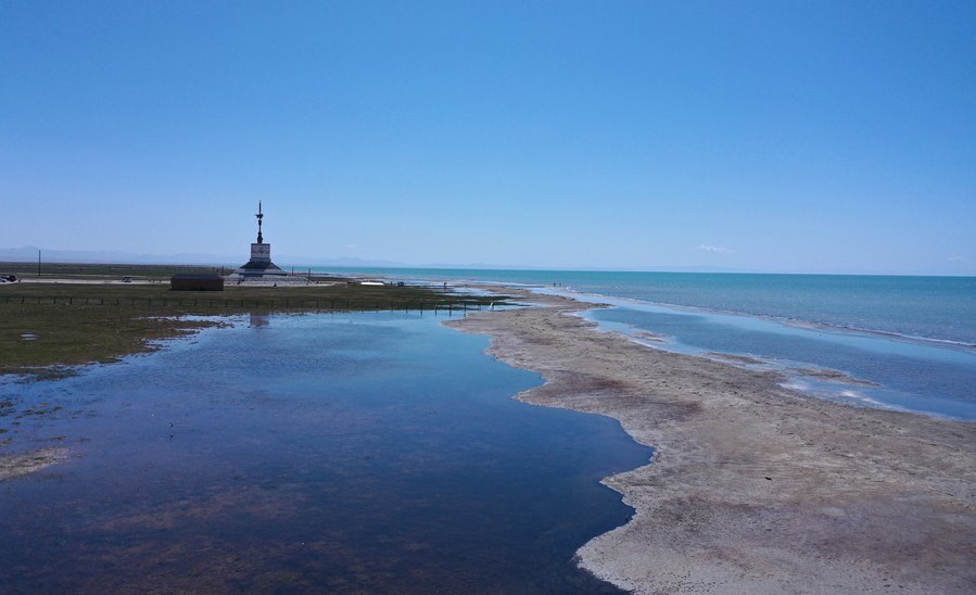 Aerial photo taken on June 5, 2021 shows a view of a scenic spot of Qinghai Lake in northwest China's Qinghai Province. Located in the northeastern part of the Qinghai-Tibet Plateau, the Qinghai Lake is key to maintaining the ecological balance in western China. (Xinhua/Wu Gang)