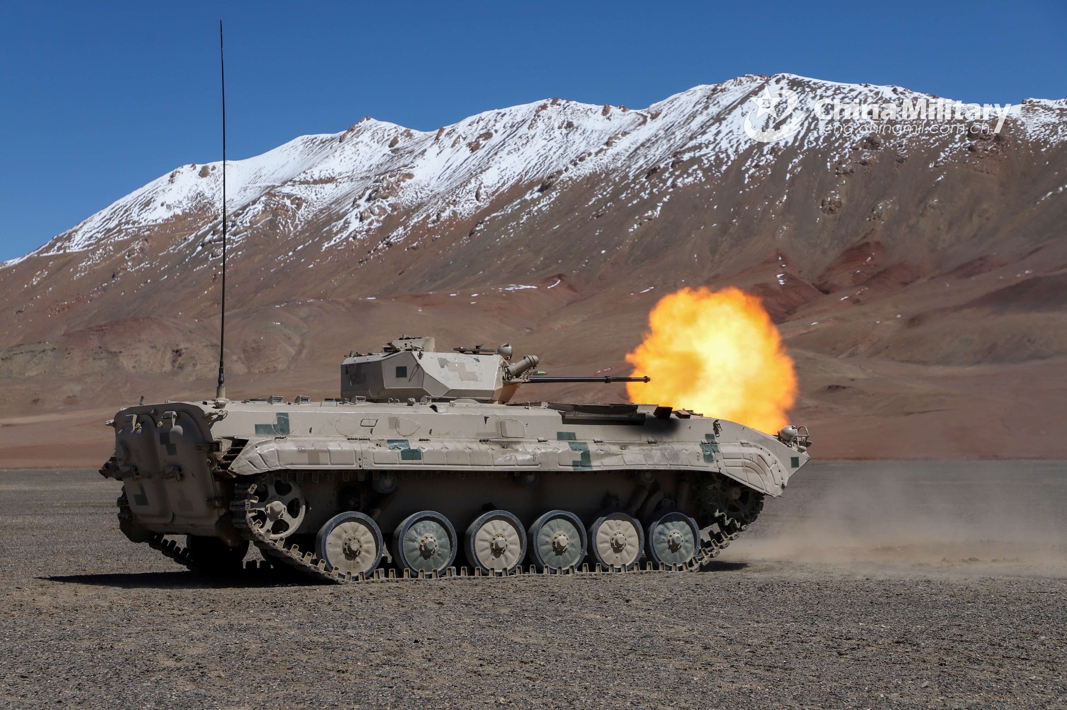 An infantry fighting vehicle attached to an armored detachment under the PLA Xinjiang Military Command participates in a realistic live-fire training exercise in Xinjiang Uygur autonomous region on June 8, 2021. (eng.chinamil.com.cn/Photo by Shi Jinguang)