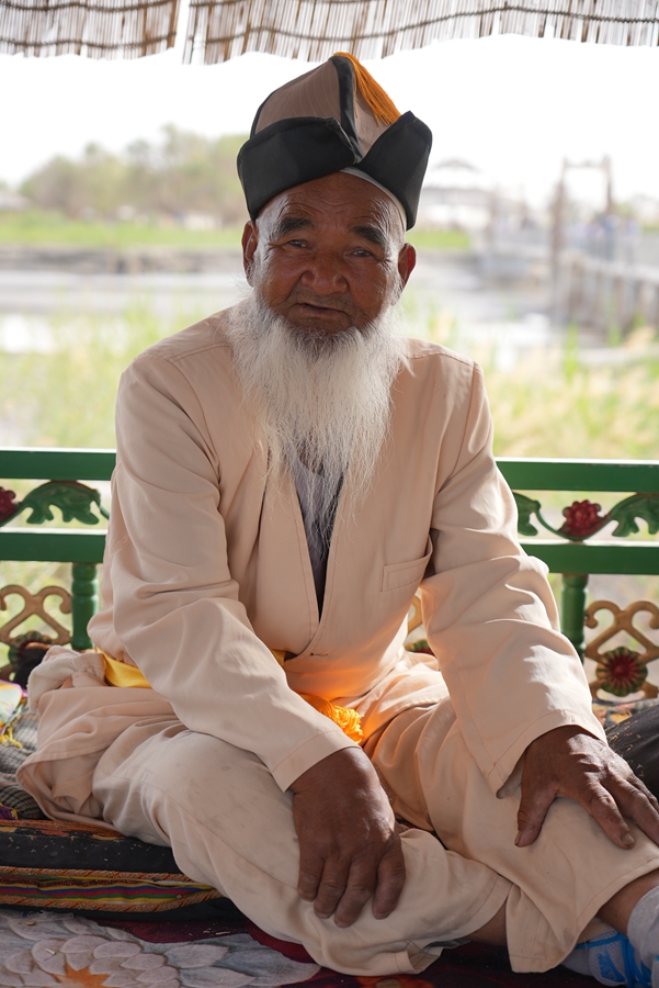 At the age of 103, Mammut has become a local celebrity. Wearing his family heirlooms, a Lop Nur-style long linen robe and a boat-shaped woollen hat, he is known by tourists as the “centenarian Lop Nur wise man”. Everyday, he carves small canoe souvenirs out of populus wood, and shares stories of the Lop Nur people with the visitors.