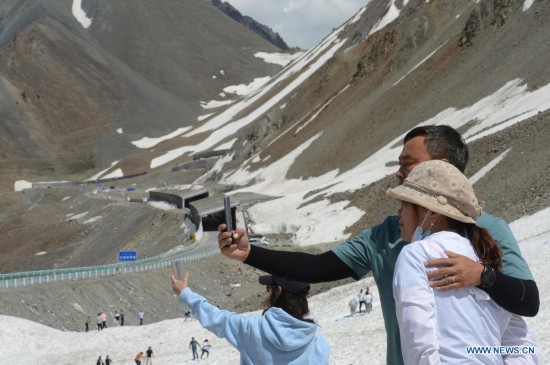 Tourists take selfies with snow mountains along the Duku Highway in northwest China's Xinjiang Uygur Autonomous Region, July 9, 2021. The 560-km highway, connecting Dushanzi in the northern area of Xinjiang Uygur Autonomous Region and Kuqa City in the south, runs through various landscapes including glaciers, forests, and grasslands. (Xinhua/Xu Sheng)