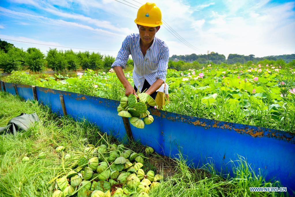 A villager harvests lotus seedpods in Lianying Village, Xiangtan City, central China's Hunan Province, July 11, 2021. (Xinhua/Chen Zeguo)