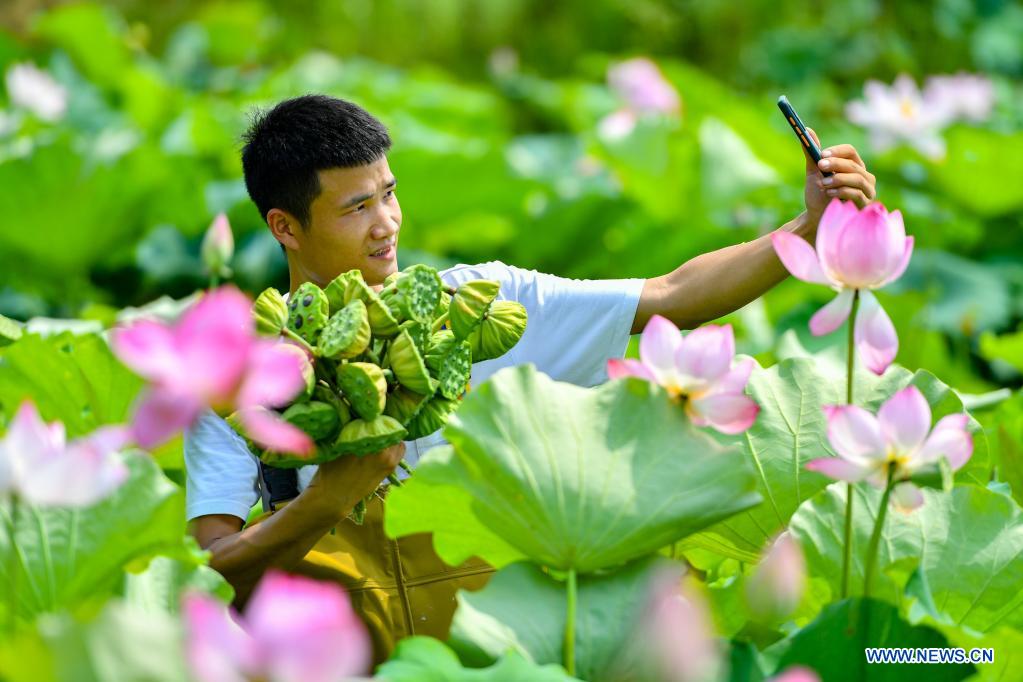 A villager promotes newly-harvested lotus seedpods through livestreams in Lianying Village, Xiangtan City, central China's Hunan Province, July 11, 2021. (Xinhua/Chen Zeguo)