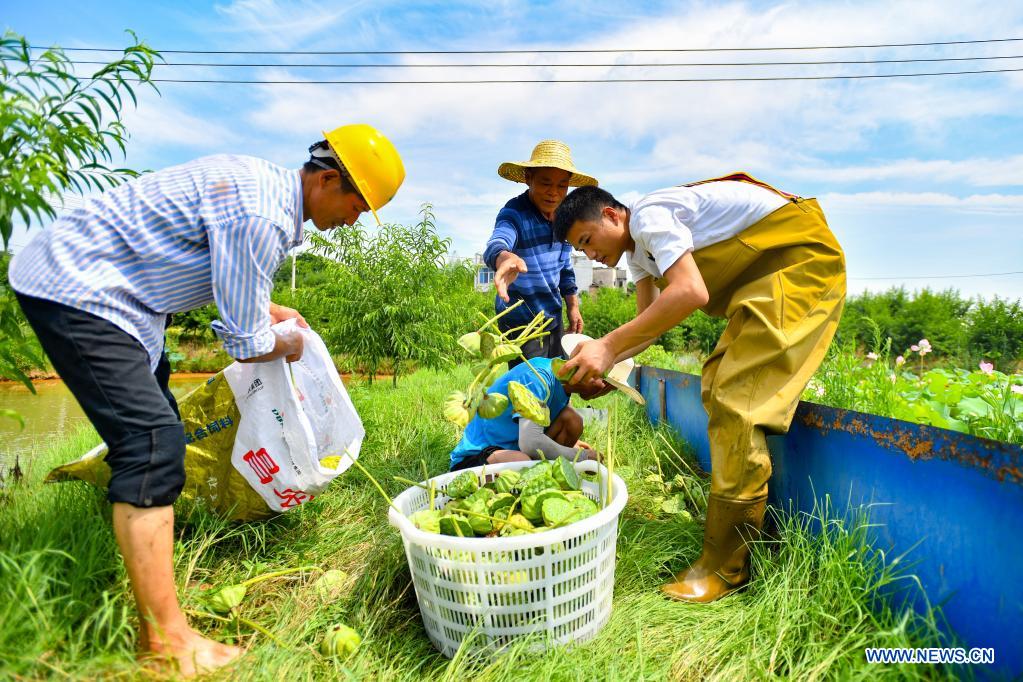 Villagers harvest lotus seedpods in Lianying Village, Xiangtan City, central China's Hunan Province, July 11, 2021. (Xinhua/Chen Zeguo)