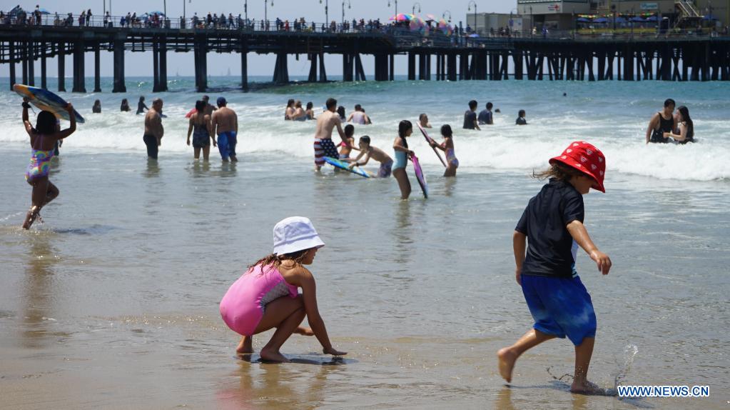 People cool themselves at Santa Monica beach in Los Angeles, California, the United States, on July 11, 2021. A heat wave recently hit parts of the western United States. (Photo by Zeng Hui/Xinhua)