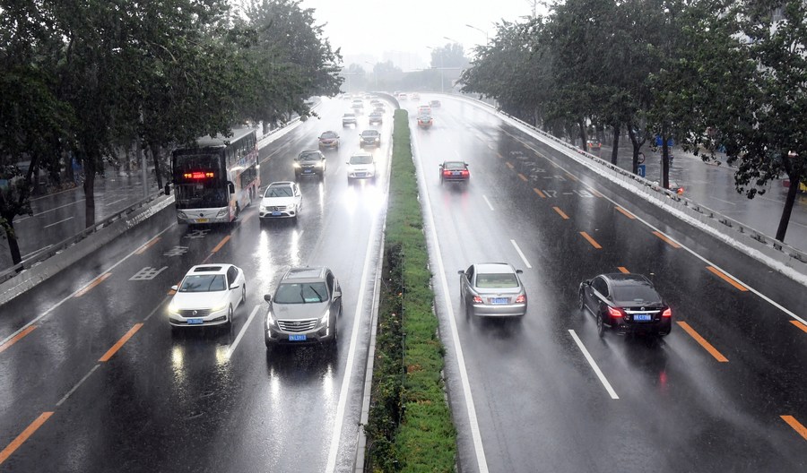 Cars run in rain in Haidian District of Beijing, capital of China, July 12, 2021. Heavy rainstorms have lashed the Chinese capital Beijing since 6 p.m. Sunday. (Xinhua/Ren Chao)