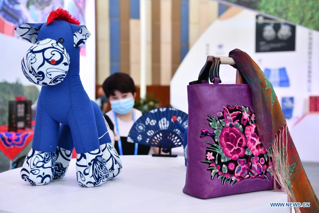 Handicrafts are seen at Eco Forum Global Guiyang 2021 in Guiyang, capital of southwest China's Guizhou Province, on July 12, 2021. China's only national-level global forum themed on ecological civilization, Eco Forum Global Guiyang 2021, opened on Monday in Guiyang. The two-day conference, centering on the country's green and low-carbon transition to build a community of life for humans and nature, will witness a range of online and offline activities. (Xinhua/Yang Wenbin)