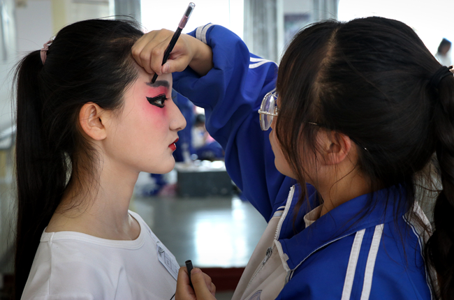 A member of the opera club helps her teammate put on make up. (Photo courtesy of the Yinchuan Experimental Middle School)