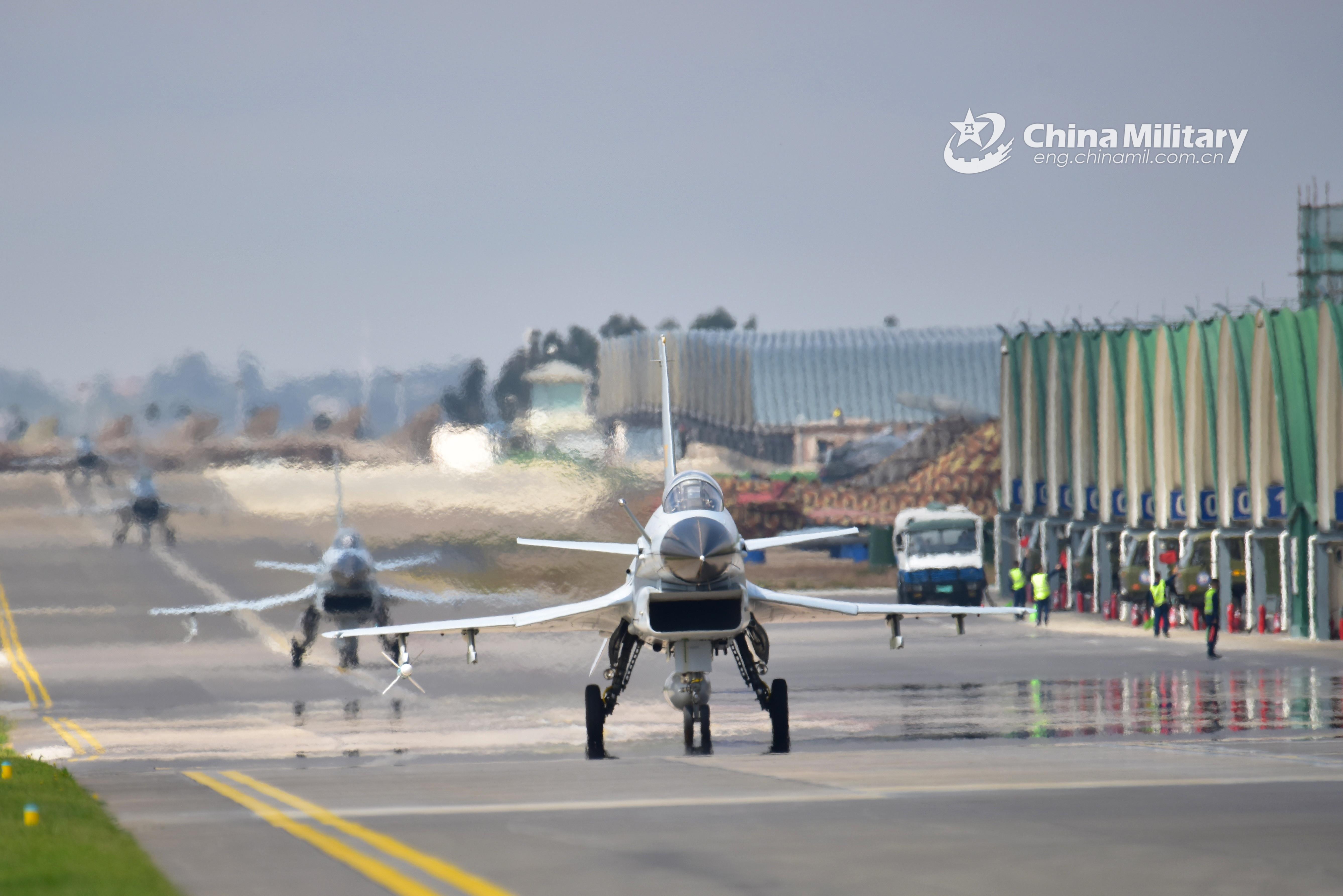 Fighter jets attached to an aviation brigade of the air force under the PLA Southern Theater Command taxi in formation on a runway before takeoff during a recent 24-hour flight training exercise. (eng.chinamil.com.cn/Photo by Zhang Xuemin)