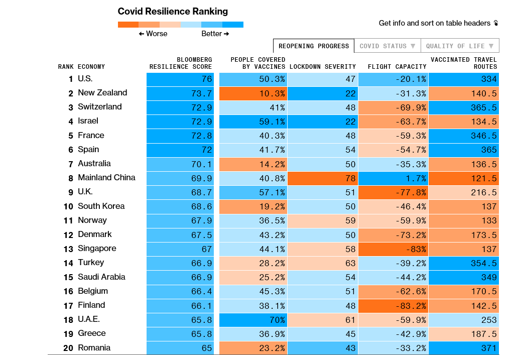 Screenshot of Bloomberg’s latest edition of the Covid Resilience Ranking