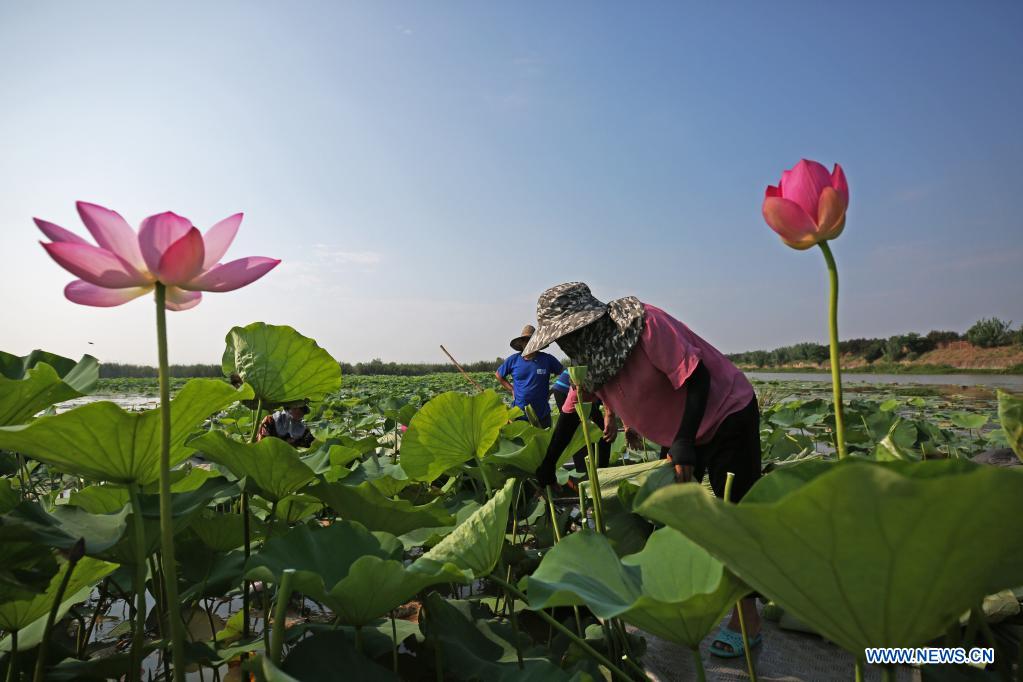 Villagers harvest lotus leaves on the Hongze Lake in Sihong County, east China's Jiangsu Province, July 14, 2021. (Photo by Xu Changliang/Xinhua)