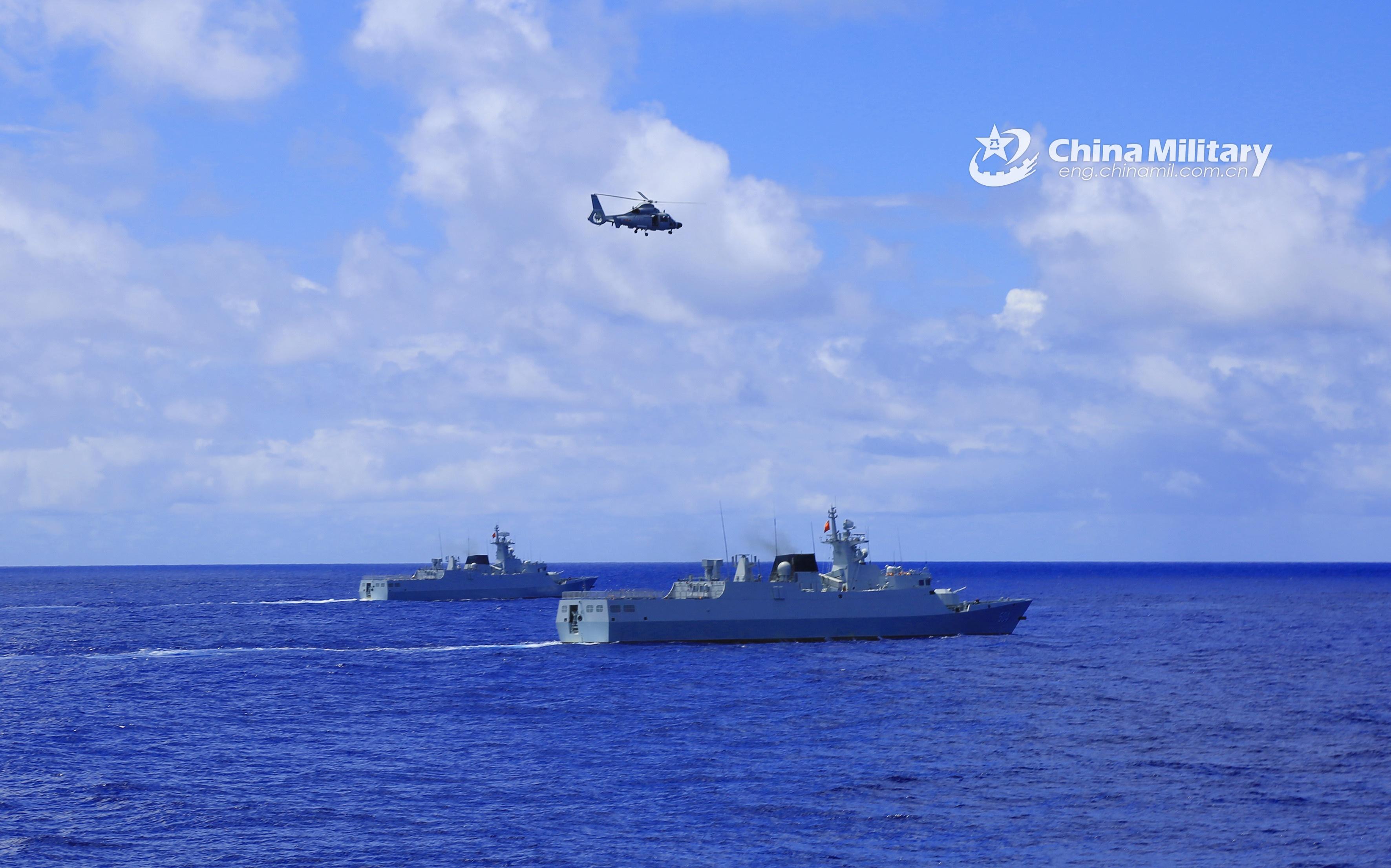 A ship-borne helicopter attached to the navy under the PLA Southern Theater Command coordinates with the guided-missile frigates during a recent realistic far-sea training exercise. The training exercise mainly focused on such subjects as live-fire, air-defense, anti-missile, and replenishment-at-sea. (eng.chinamil.com.cn/Photo by Xue Chengqing)