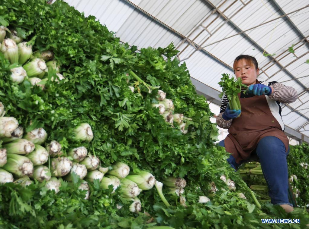 A villager processes highland vegetables at a warehouse in Anding District of Dingxi, northwest China's Gansu Province, July 13, 2021. Taking advantage of the cool summer climate in Dingxi, a plateau city in northwest China, local farmers have been encouraged to plant more than 20 varieties of highland vegetables. By successfully selling these vegetables to the country's coastal provinces, the local highland vegetable businesses have proven a key industry that boosts rural income growth. (Xinhua/Ma Xiping)