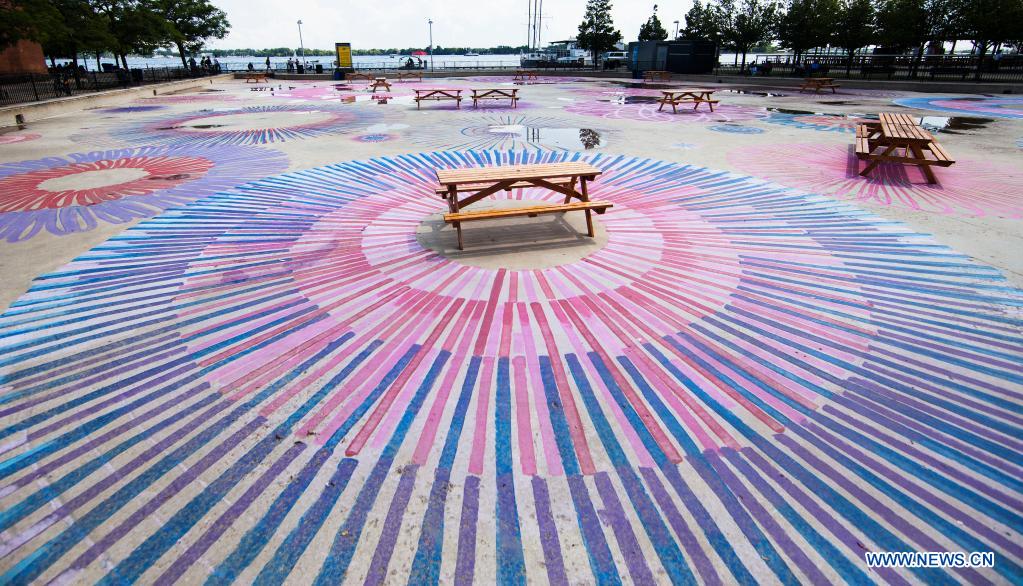 A floor mural with spirals, loops and circles is seen during a visual arts exhibition at Hahourfront Center in Toronto, Canada, on July 14, 2021. (Photo by Zou Zheng/Xinhua)