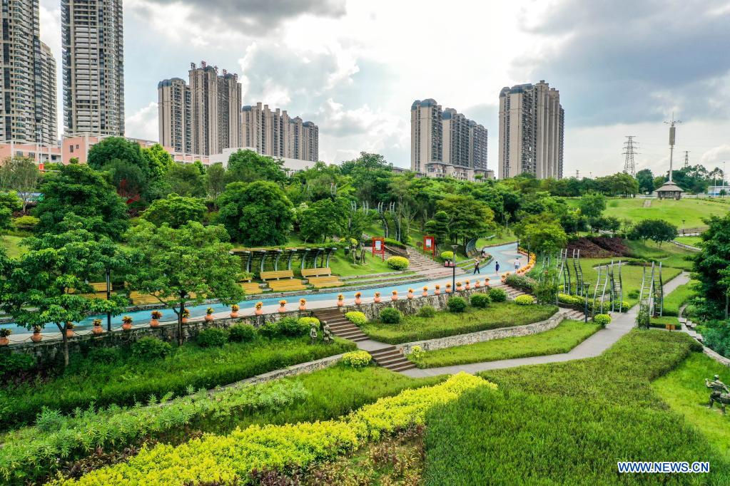 Aerial photo taken on July 11, 2021 shows the Nakao River wetland park in Nanning, south China's Guangxi Zhuang Autonomous Region. Nakao River in Nanning was once a polluted muddy gutter lined with sewage outlets. In 2015, a public-private partnership (PPP) project was rolled out to improve the ecological environment along the river. Pollution control measures including sewage interception and treatment, as well as aquatic ecosystem restoration, have helped turn the river into a wetland park with lucid waters. (Xinhua/Cao Yiming)