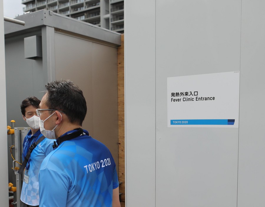 Tokyo 2020 staff on duty at the fever clinic entrance in the Olympic Village, June 20, 2021. (Xinhua/Wang Zijiang)