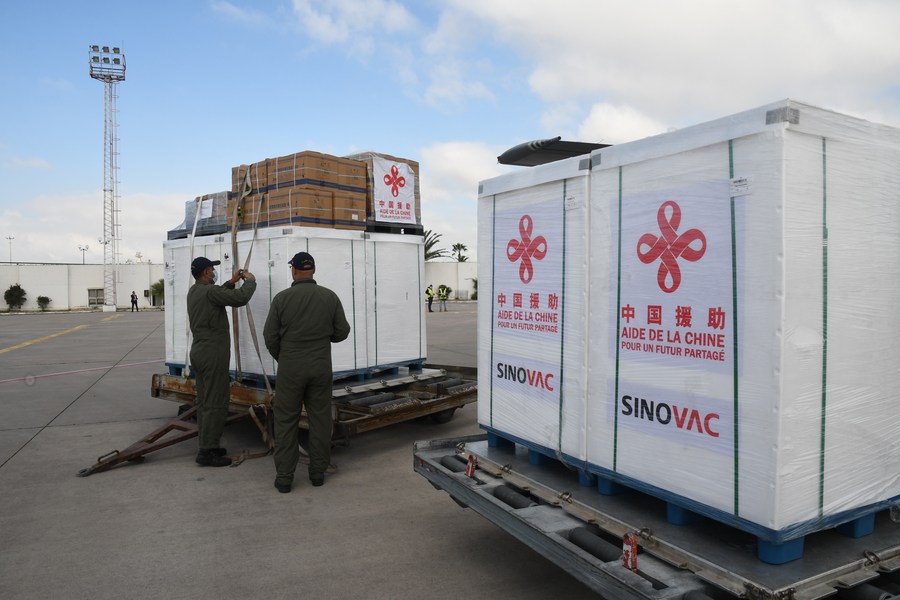 Airport workers unload the China-aided COVID-19 vaccine at the Carthage International Airport in Tunis, Tunisia, March 25, 2021. (Photo by Adel Ezzine/Xinhua)