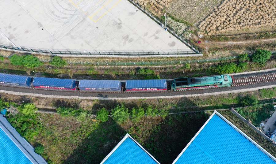 Aerial photo taken on May 26, 2020 shows a China-Europe freight train carrying mechanical accessories, fabrics and solar photovoltaic products bound for Hanoi of Vietnam leaving a logistics hub in Hai'an, east China's Jiangsu Province. (Xinhua/Ji Chunpeng)