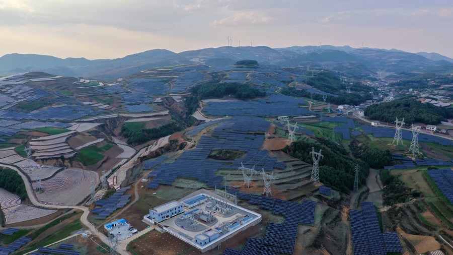 Photo taken on June 3, 2021 shows the view of Xianshuiwo photovoltaic power plant in southwest China's Guizhou Province. (Photo by Pan Cong/Xinhua)