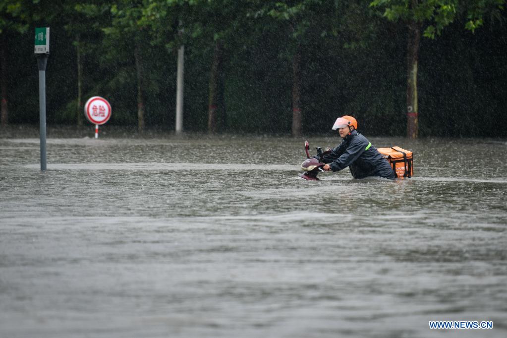A courier wades through a waterlogged road in Zhengzhou, capital of central China's Henan Province, July 20, 2021. More than 144,660 residents have been affected by torrential rains in central China's Henan Province since July 16, and 10,152 have been relocated to safe places, the provincial flood control and drought relief headquarters said Tuesday. A total of 16 large and medium-sized reservoirs have seen water levels rise above the alert level after torrential rains battered most parts of the province on Monday and Tuesday. (Photo by Hou Jianxun/Xinhua)