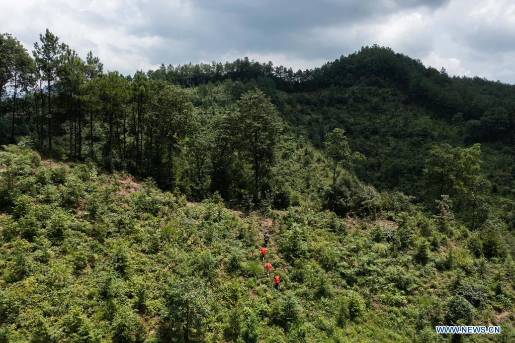 In this aerial photo, volunteers patrol a forest area in Shangyang Village of Taihuyuan Township in Hangzhou, capital of east China's Zhejiang Province, July 20, 2021. The forest area covering some 22 hectares was launched in 2017 aiming to help reduce carbon dioxide emissions and achieve carbon neutrality. (Xinhua/Xu Yu)