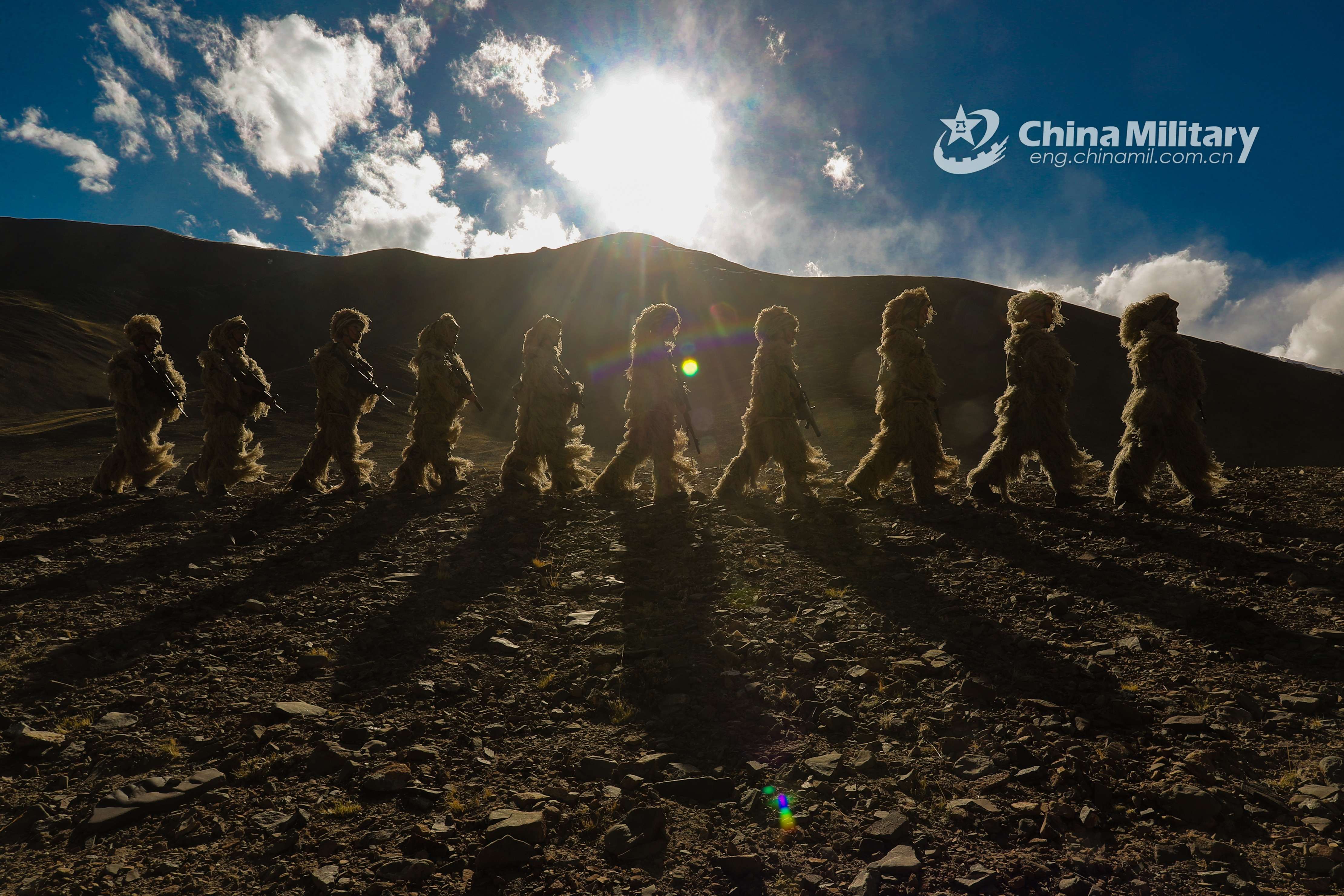 Soldiers wearing ghillie suits, a type of camouflage gear, cover each other in firing position while marching in the cobbled wild during a reconnaissance tactical training exercise in mid June, 2021. They are assigned to a reconnaissance company with a combined arms regiment under the PLA Xinjiang Military Command. (eng.chinamil.com.cn/Photo by Xiang Liming)