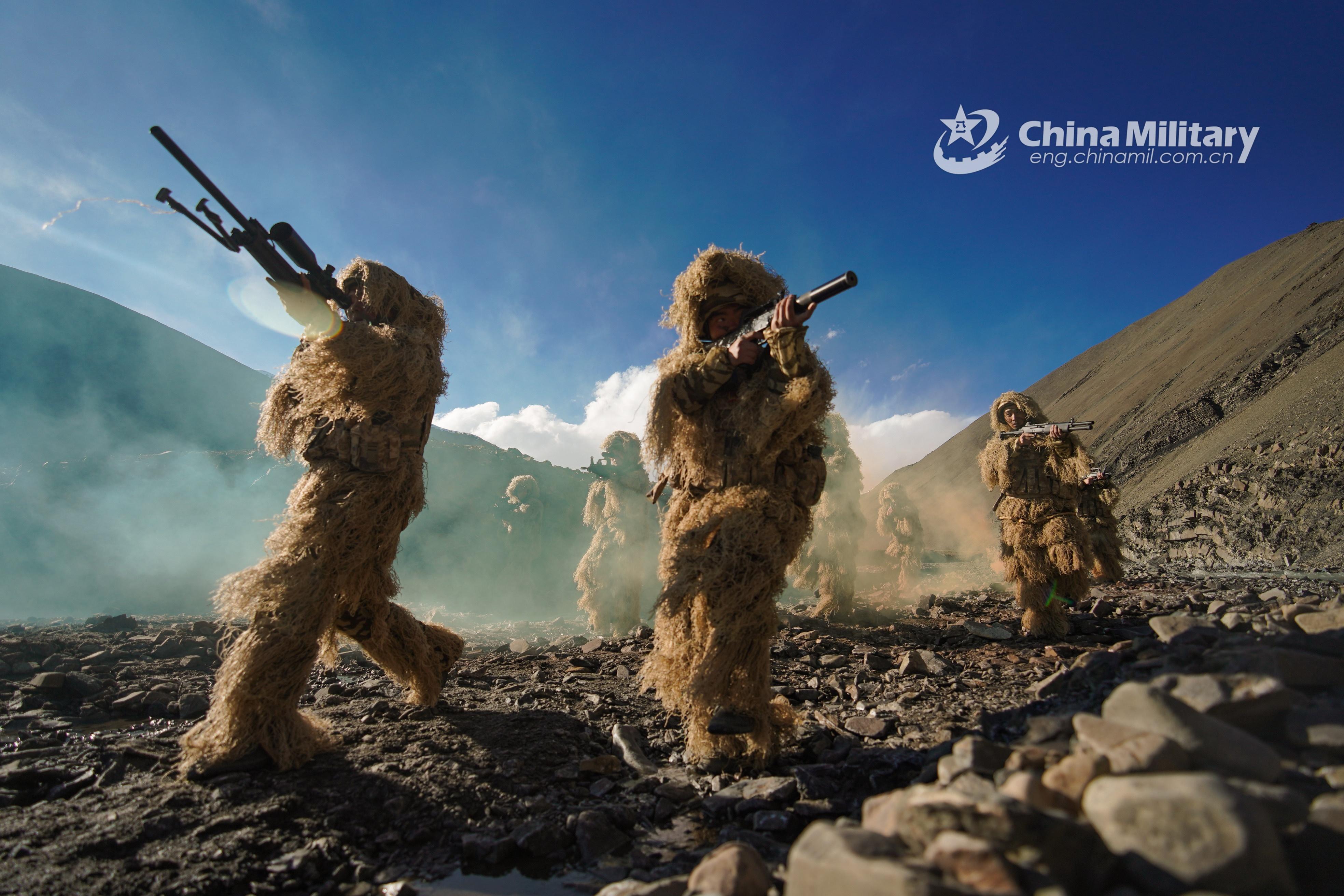 Soldiers wearing ghillie suits, a type of camouflage gear, cover each other in firing position while marching in the cobbled wild during a reconnaissance tactical training exercise in mid June, 2021. They are assigned to a reconnaissance company with a combined arms regiment under the PLA Xinjiang Military Command. (eng.chinamil.com.cn/Photo by Xiang Liming)