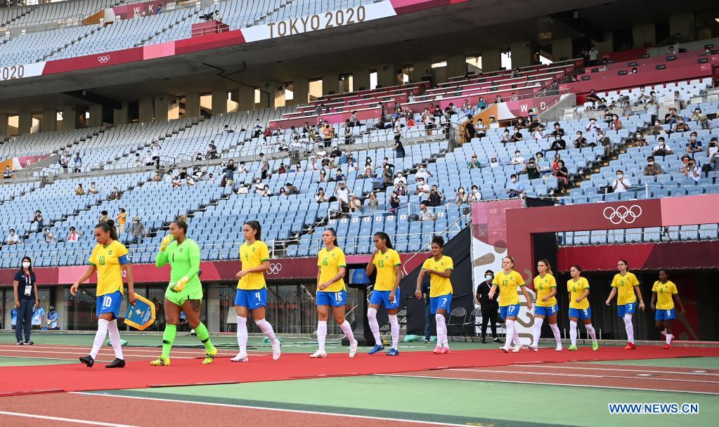 Players of Brazil women's football team enter the Miyagi Stadium before Tokyo 2020 women's football group F match between China and Brazil in Miyagi, Japan, July 21, 2021. (Xinhua/Lu Yang)