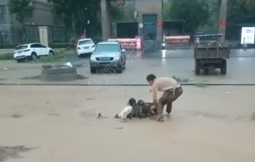A passerby risked his life to stretch out a helping hand and pull a mother and two children out of deep water at a waterlogged road of Zhengzhou, Central China's Henan Province on Tuesday.